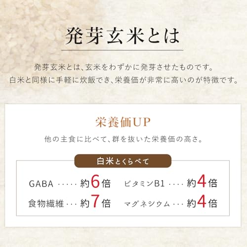 発芽玄米は、玄米を0.5~1.0mmほど発芽させたお米で、普通の白米と比較して栄養価が高い玄米をより食べやすく加工したお米となっています。